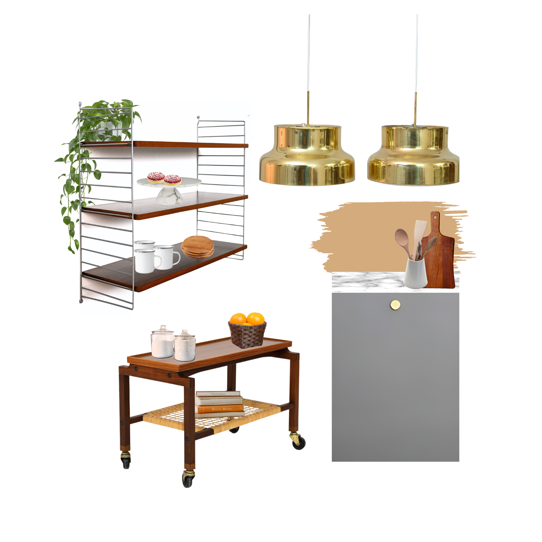 Per completare il look di una cucina scandinava, sono immancabili tre pezzi vintage chiave: carrelli, lampade e scaffali a muro con montanti a scaletta. Questi pezzi aggiungono carattere e autenticità allo spazio.Moodboard per lo styling.