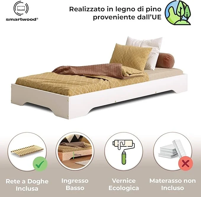 Misure: per i miei clienti ho suggerito la versione da 183 x 83 x 18 cm, ma ci sono tantissime misure di questo modello, tra cui scegliere. Ecco perché puoi usare la struttura letto anche solo per sollevare da terra un materassino o una coppia di materassini che hai già e rendere più sofisticato e stabile il lettino.