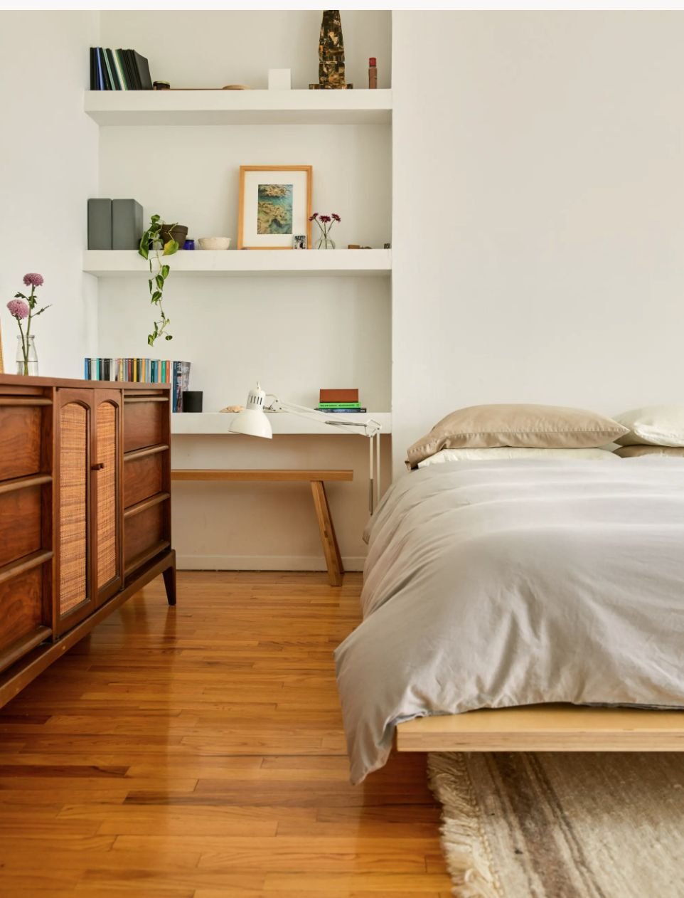In camera da letto, le mensole e le librerie in cartongesso diventano uno strumento prezioso per rifinire e dare senso alle pareti più difficili.