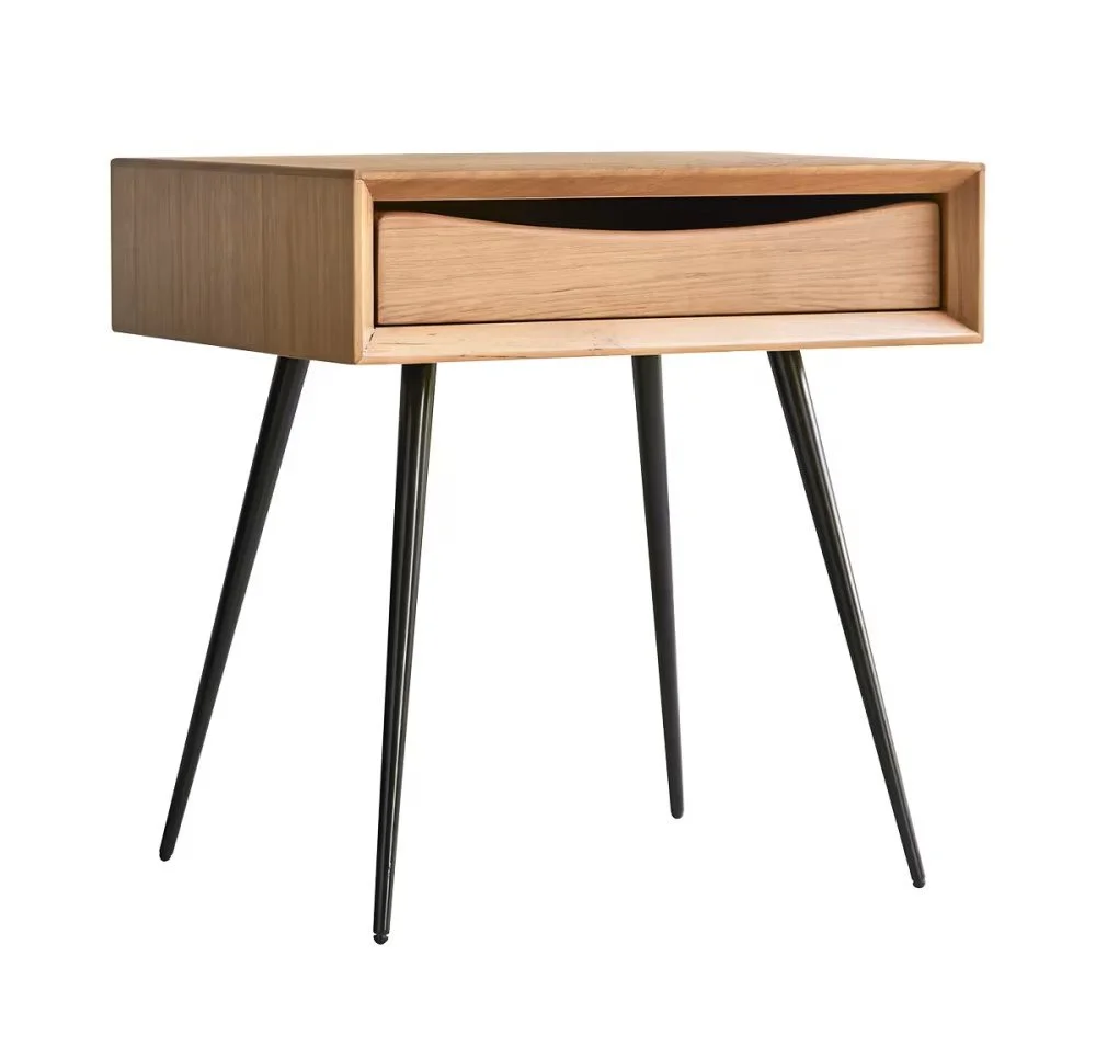 Il cassetto singolo offre uno spazio ordinato per gli oggetti quotidiani, mentre le gambe leggermente inclinate richiamano il design mid century.