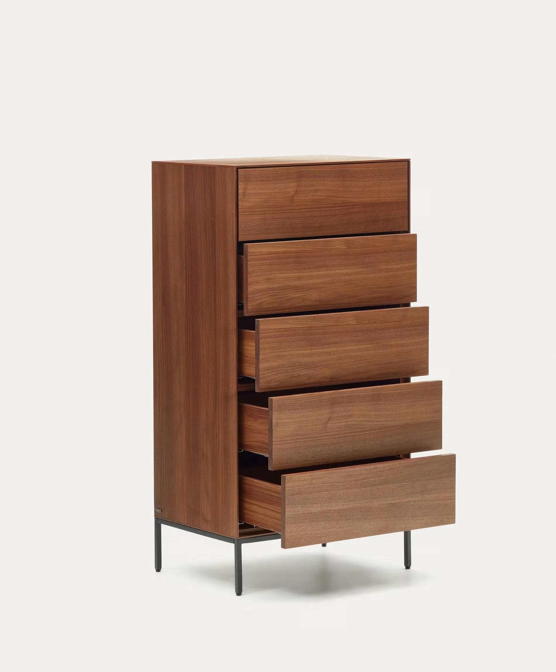 Vedrana è una di quelle cassettiere che fanno subito atmosfera. L’impiallacciatura di noce porta calore e carattere, mentre le gambe in acciaio antracite la rendono leggera e contemporanea.