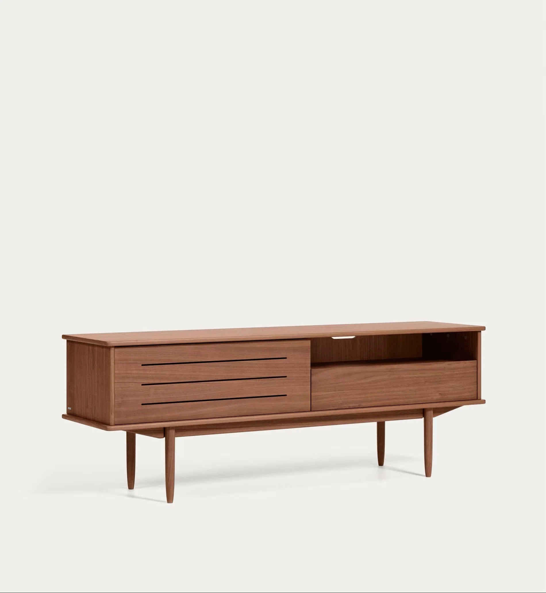 Un mobile tv dal look vintage e scandinavo, dalla base sinuosa, con i tipici piedini obliqui e dotato di un pratico cassetto e di ben due fori passacavo.