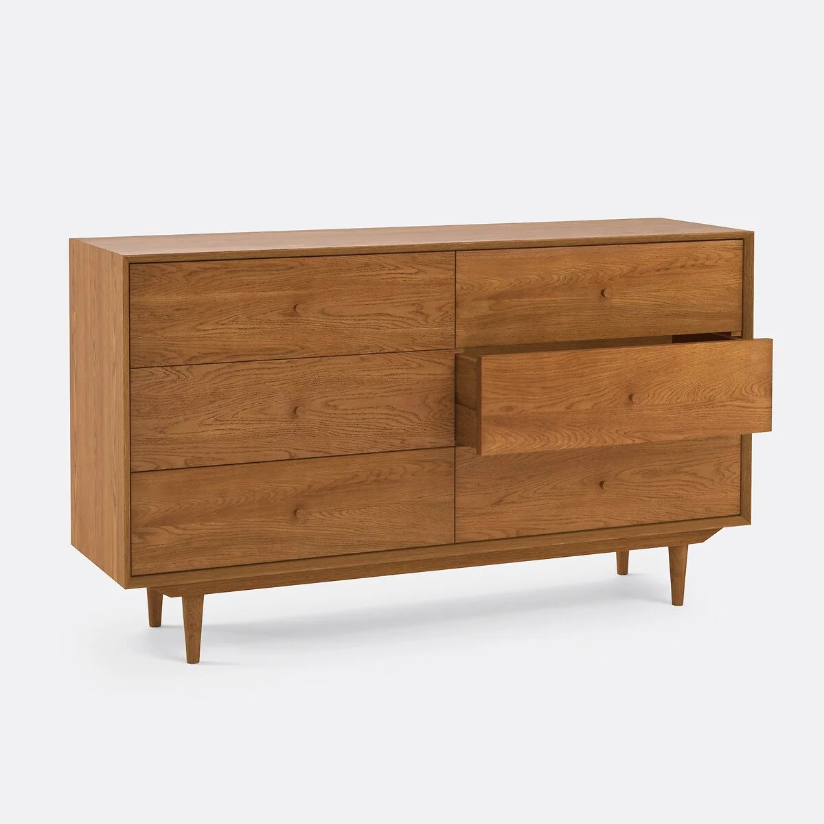 I 5 cassetti con apertura a pressione mantengono il design pulito (niente maniglie in vista), così resta protagonista la bellezza del legno.