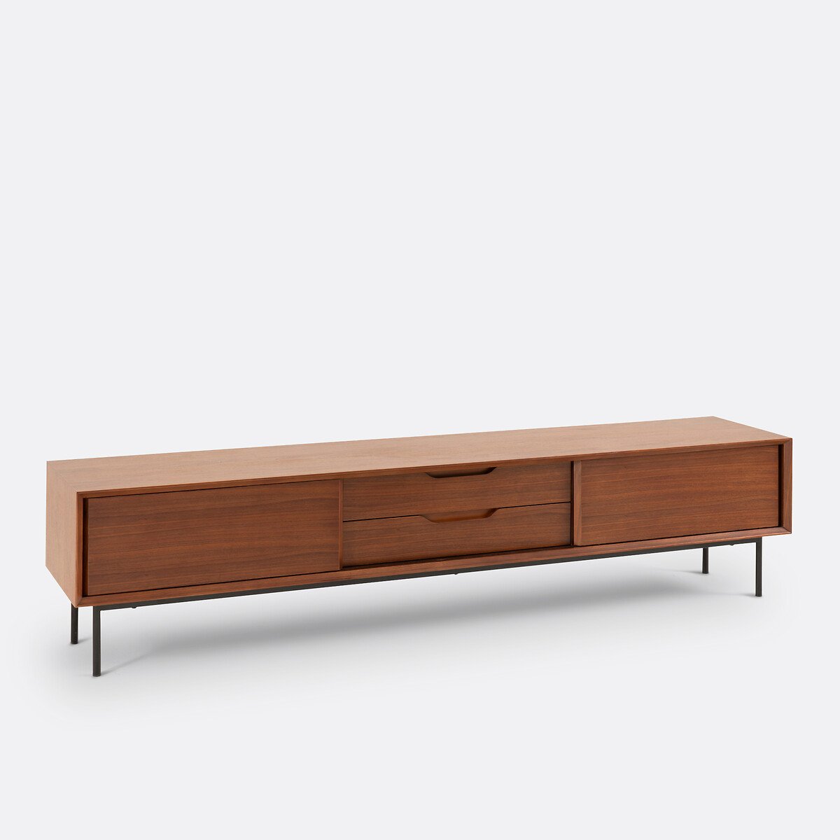 Lungo 200 cm, questo mobile tv è la reinterpretazione moderna di un tipico arredo scandinavo con piedini in metallo nero. Rivestito da impiallacciatura di noce, può ospitare anche uno schermo grande, grazie alla generosa ampiezza.