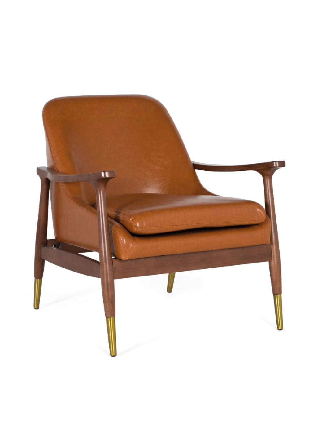 Seduta e schienale imbottiti sono rivestiti in PU (un materiale sintetico che viene usato come alternativa alla pelle). I braccioli curvi e le gambe affusolate con terminali dorati aggiungono un tocco elegante e mid-century.