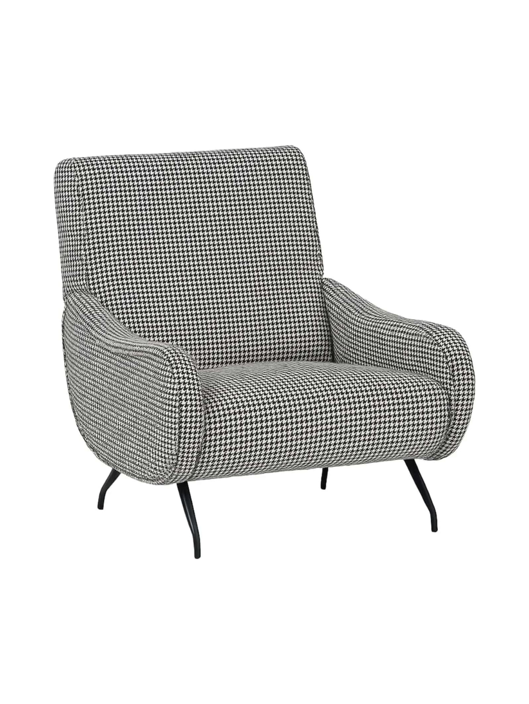 Poltrona in stile anni ’50 con piedini in metallo, rivestita in elegante tessuto pied de poule bianco e nero.